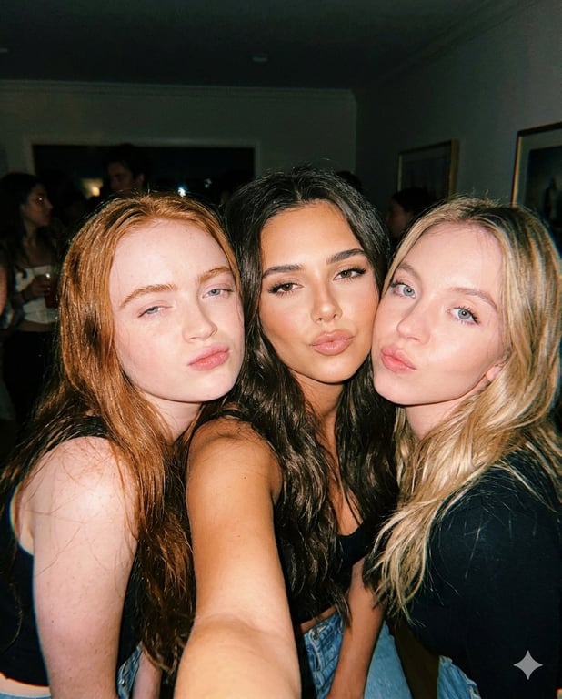 A structured JSON prompt for Nano Banana Pro to generate an indoor party selfie featuring three subjects (Sadie Sink, Sydney Sweeney, and the user) with a vintage flash aesthetic. The prompt specifies harsh direct flash lighting, tight composition, specific expressions (pout lips), and realism details like visible grain and skin texture, requiring three reference images for identity preservation.