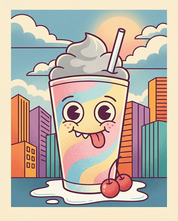 A prompt for generating a cute, cartoonish milkshake character with expressive features (eyes, tongue, teeth) set against an urban backdrop, rendered in a whimsical, retro 70s graphic design style with bold shapes and vibrant colors.
