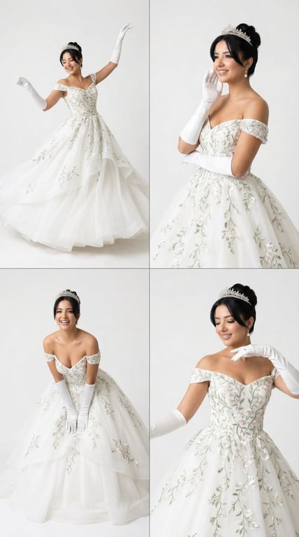 A structured prompt for generating a photorealistic 2x2 editorial grid featuring one elegant woman with consistent facial identity across all panels. She is styled as a modern princess in a luxurious white embroidered ball gown with a tiara and opera gloves, set against a bright white minimal background, showcasing different graceful dance poses.