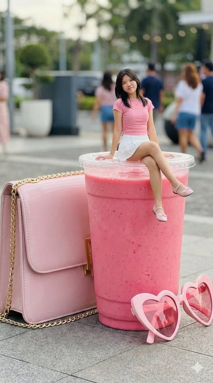 A photorealistic prompt for generating a scene where a tiny woman sits casually on the lid of a giant strawberry milkshake cup placed on outdoor pavement, surrounded by other oversized accessories like a handbag and sunglasses.