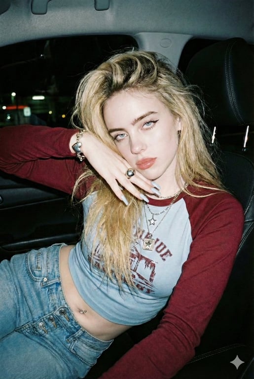 A detailed prompt for generating a Y2K-inspired, candid nightlife portrait of a woman in a car interior. It specifies the subject's appearance (voluminous blonde hair, specific makeup), detailed fashion (two-tone crop top, low-rise jeans), and accessories (layered silver jewelry, coffin nails). Crucially, it mandates direct on-camera flash lighting for high contrast and an authentic film grain aesthetic.