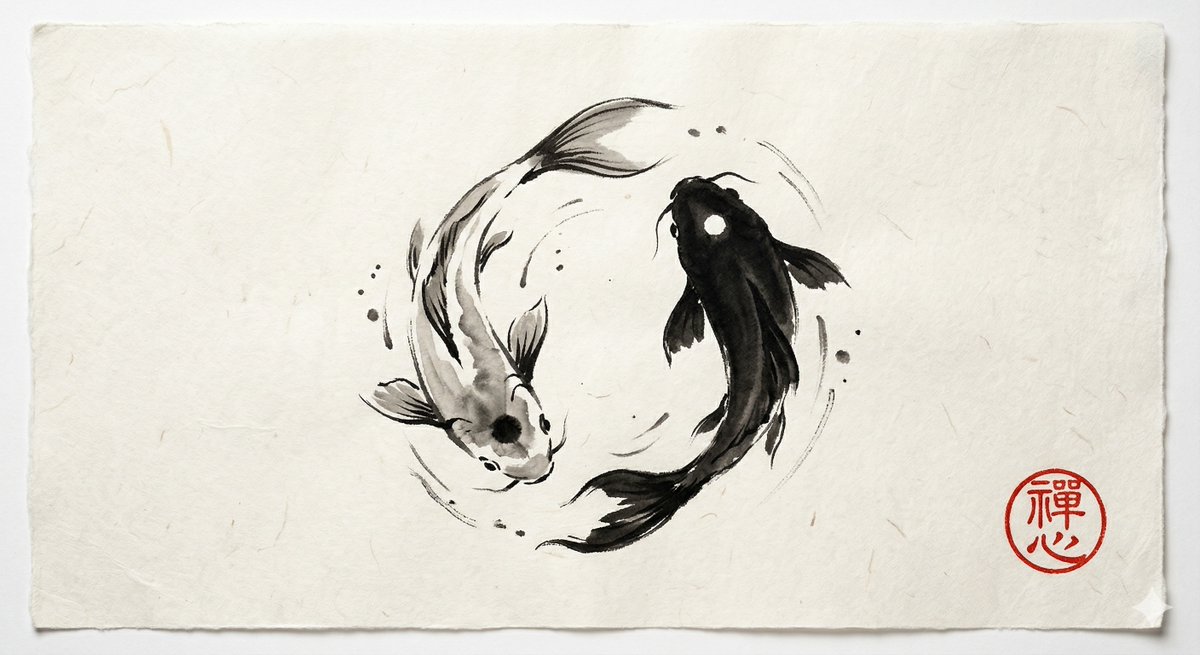 A prompt for generating a minimalist Japanese Sumi-e ink painting of two koi fish (Yin and Yang) with Washi paper texture and a red Hanko stamp signature, using Nano Banana Pro.