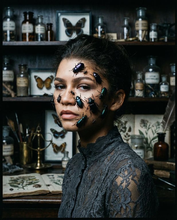 An extremely detailed JSON prompt for generating a hyper-realistic, macro-cinematic surreal portrait (Zendaya style). The subject's face is partially obscured by a swarm of jewel-toned obsidian insects in a chaotic Victorian Entomology Workshop. It specifies dramatic Chiaroscuro lighting, microscopic fidelity (Phase One XF IQ4), and the gritty, organic grain of Kodak Tri-X 400 film stock.