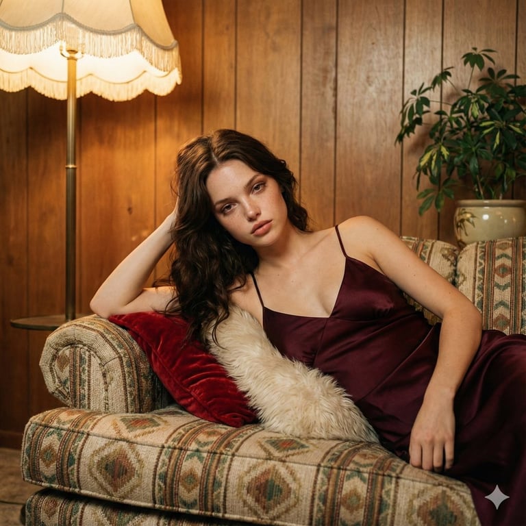 A detailed image generation prompt for a cinematic, square portrait with a 1970s retro aesthetic, featuring a woman reclining on a patterned couch in a deep burgundy satin slip dress, illuminated by a warm tungsten vintage floor lamp, emphasizing realistic skin texture and soft lighting.
