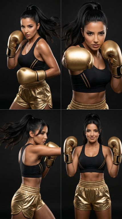A complex JSON prompt for Nano Banana Pro to create a 2x2 high-fashion boxing editorial collage. The prompt demands consistency across all four panels for the same female boxer, specific styling (gold shorts/gloves, black top with gold accents), and defines the pose and composition for each of the four panels, aiming for a luxurious, intense, photorealistic sports campaign look.