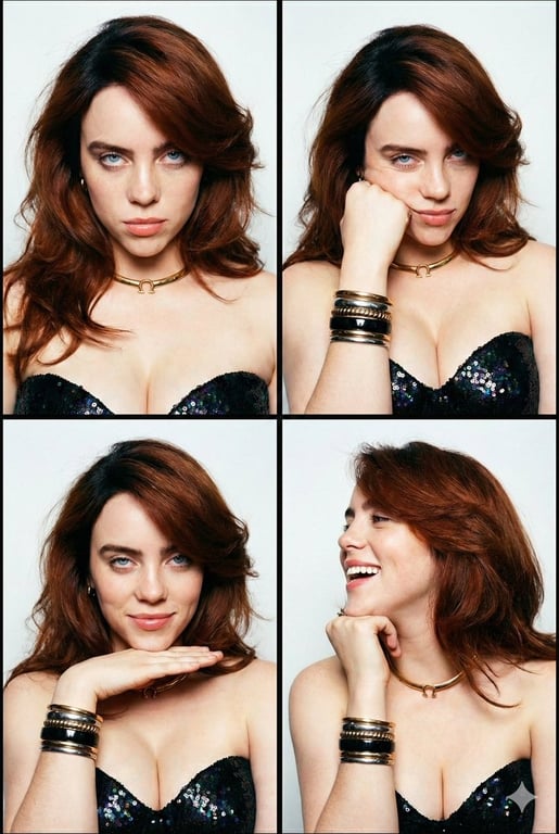 An image generation prompt for a 2x2 photo grid/collage featuring Billie Eilish in a high-contrast, Y2K-inspired style. The prompt specifies her auburn hair, black sequin bustier, and details four different moods/poses for each frame (Intense, Playful Boredom, Confident, Candid Laugh) against a plain white background.