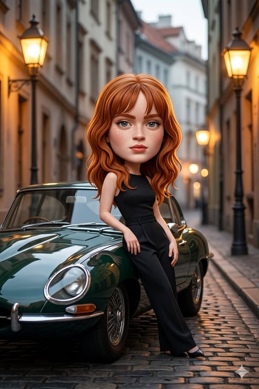 A prompt for Google Gemini Nano Banana Pro to transform an uploaded image into a stylized 3D cartoon caricature with an oversized head and smaller body, while strictly preserving the subject's facial identity and expression. The scene places the subject leaning against a vintage dark green classic car on a cobblestone street.