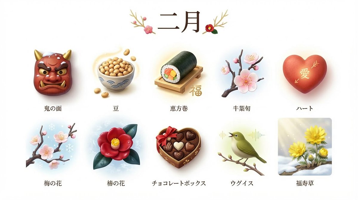 A prompt designed to generate a collection of 3D icons that symbolize the mood and objects associated with a specific month in Japan. The icons are rendered in a colorful yet subdued 3D style with atmospheric lighting and texture, set against a pure white background, and include a minimal title for the month.