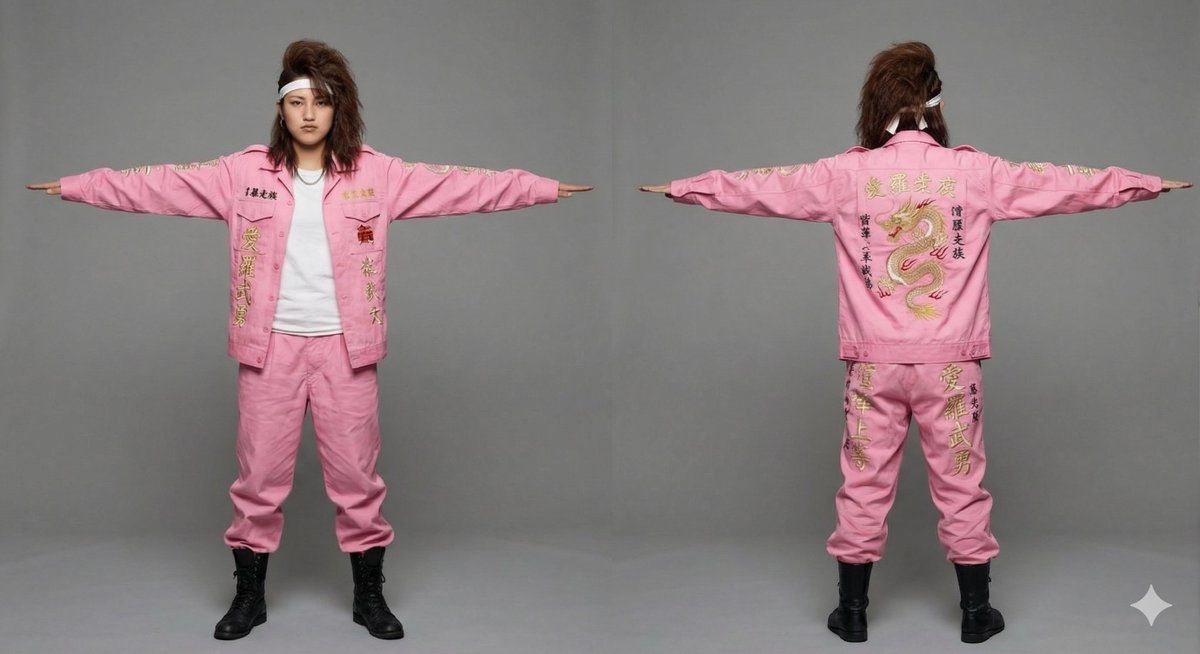 A prompt used with Google Gemini 3.1 image generator (Nano Banana Pro) to create an image of a classic Japanese Bosozoku (female) in the style of a 3D model asset.
