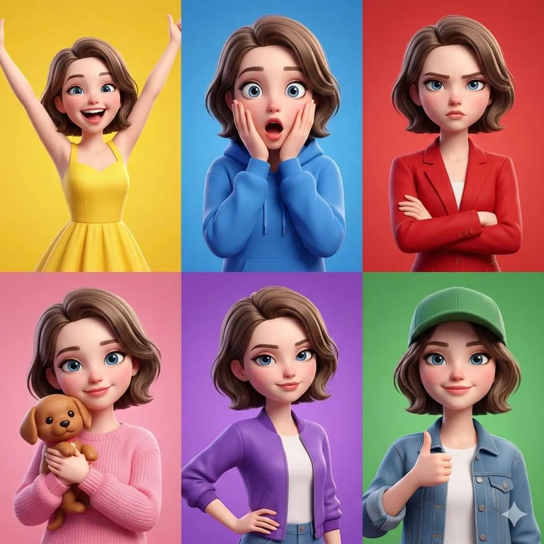 A prompt for generating a 6-panel grid of a 3D Pixar-style animated girl, showing different emotions against colorful solid backgrounds, aiming for animated movie quality.
