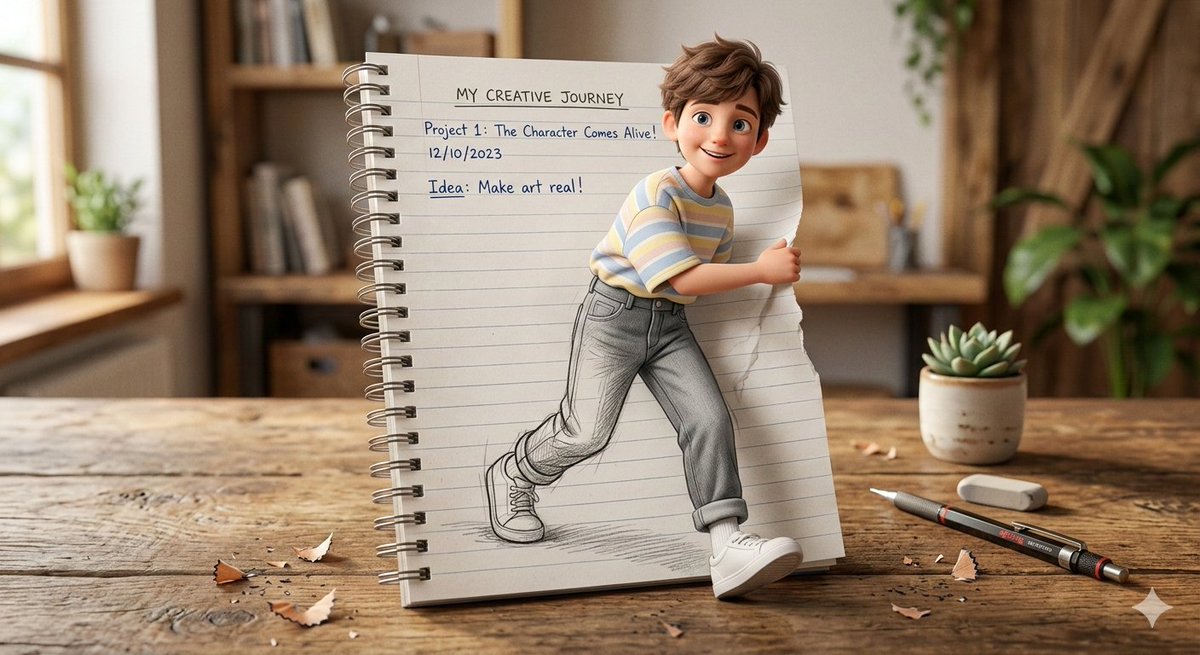 A detailed prompt for generating a creative 3D illusion artwork in a semi-realistic cartoon style, featuring a cute young boy stepping out of a spiral notebook page placed on a wooden desk. The prompt specifies the boy's appearance, clothing, the pencil-sketched lower body effect, and technical details like lighting and resolution.