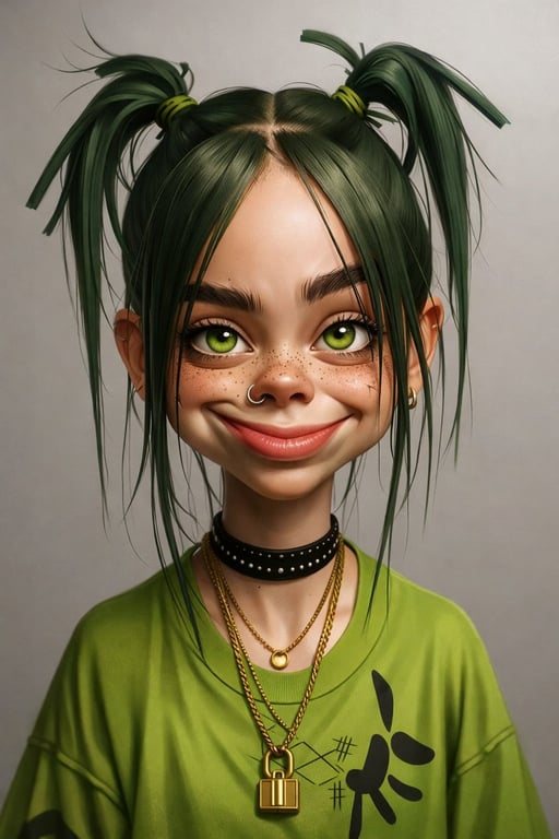 A highly detailed JSON prompt for generating a semi-realistic 3D character render portrait in 8K resolution, depicting a young woman resembling Billie Eilish with dark green hair styled in high pigtails, wearing an oversized green t-shirt, and featuring specific facial details and accessories.