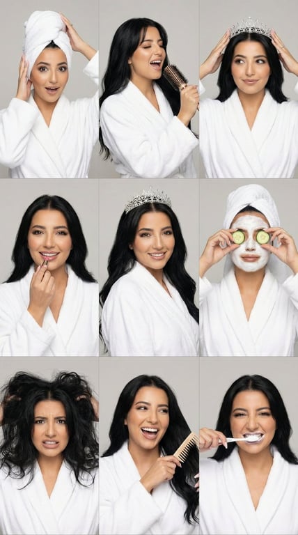 A complex, structured prompt designed to generate a 3x3 grid of photorealistic images featuring the same woman (with strict identity lock) in various 'getting ready' actions in a clean studio setting. It mandates consistency in lighting, background, and identity across all nine tiles, focusing on natural skin texture and beauty props.