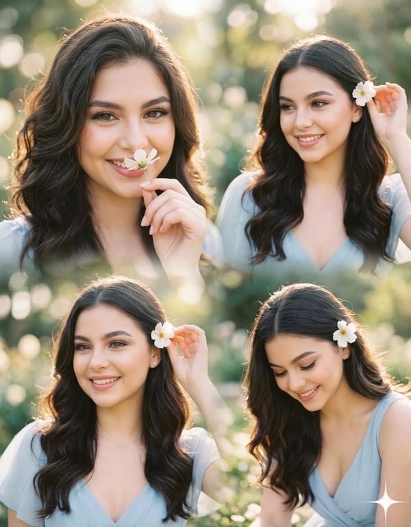 A prompt designed for creating a photorealistic 4-panel collage portrait of a smiling young woman, using an uploaded photo as a reference. It specifies the subject's appearance, clothing, a softly blurred garden background with heavy bokeh, and soft golden hour lighting for a cheerful and serene mood.