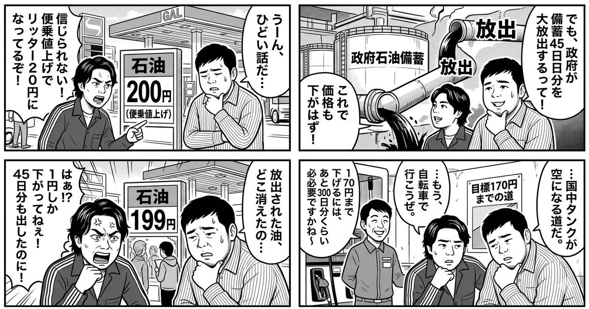 A prompt for Nano Banana Pro (Gemini 3 Pro Image) to generate a 4-panel manga titled 'The Long Road to 170 Yen Gasoline Price,' featuring the comedy duo Reiwa Roman, likely commenting on high gasoline prices.