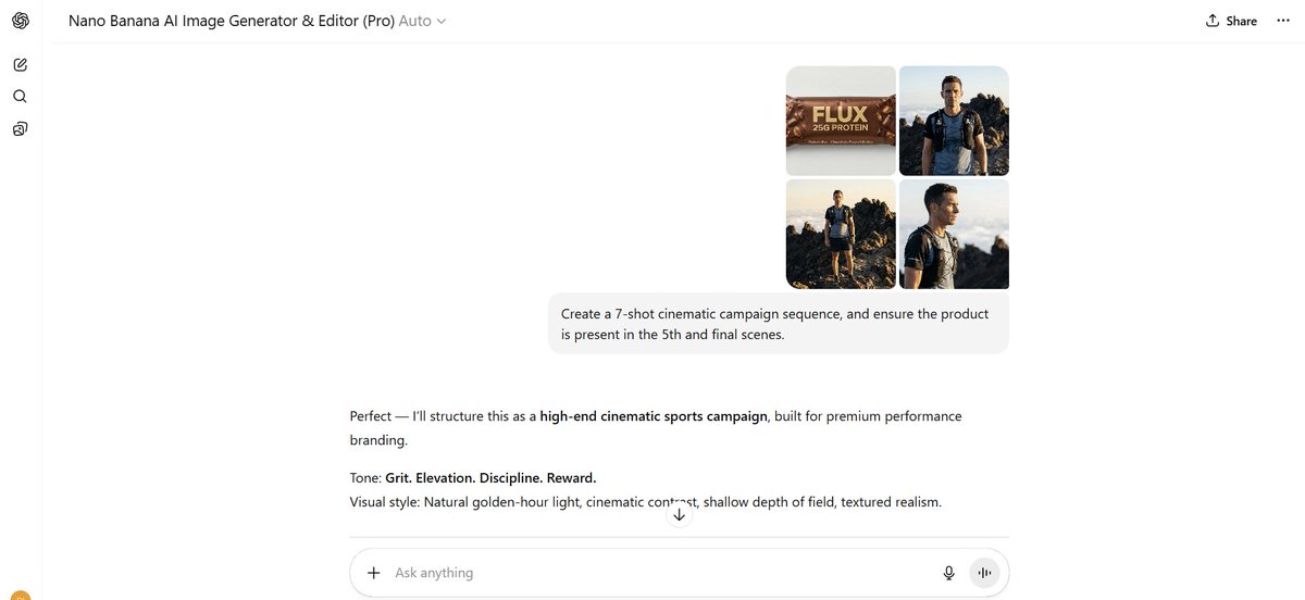 A prompt designed for the Nano Banana AI Image Generator & Editor (Pro) GPT to create a 7-shot cinematic campaign sequence. It requires uploading three character reference images and one product reference image, ensuring the product is visible in the fifth and final scenes.