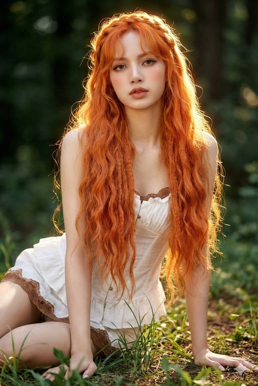 A highly detailed JSON prompt for Gemini Nano Banana Pro to generate an ultra-realistic cinematic portrait of Ana de Armas with copper-red hair, seated in a sunlit forest, emphasizing a vintage film aesthetic (Kodak Portra 400) and golden hour lighting.