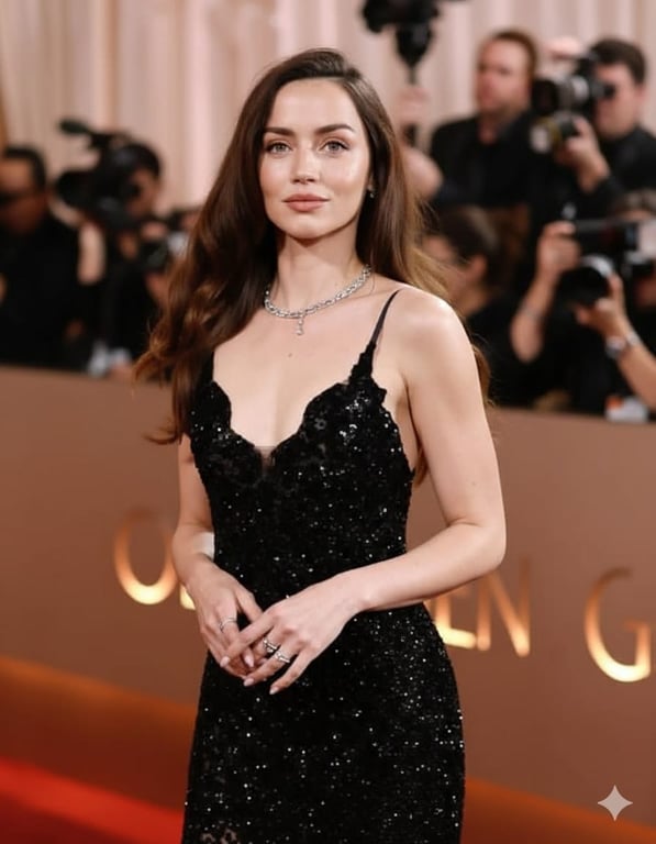 A structured prompt for generating a portrait of Ana de Armas on a red carpet, focusing on her appearance in a jet-black, sequined lace column gown. It details her makeup (soft glamour), hair (voluminous Hollywood waves), and the specific texture and style of the dress.