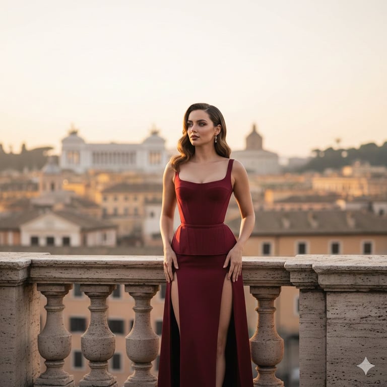 A detailed prompt for generating a vertical fashion editorial image of Ana de Armas on a stone balcony overlooking the historic Roman skyline during golden hour. The prompt specifies her outfit (structured dark red corset top and high-slit skirt), pose, and lighting to evoke a sense of timeless luxury and romance. (Identical to 2013958245023392228, but extracted separately).