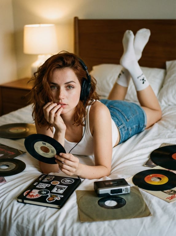 A prompt for generating a cinematic editorial lifestyle photograph with an analog film aesthetic, featuring a specified celebrity likeness (defaulting to Ana de Armas). The scene is an intimate bedroom setting, showing the subject lying prone on a bed, holding a vinyl record, surrounded by scattered music accessories, evoking a nostalgic indie mood.