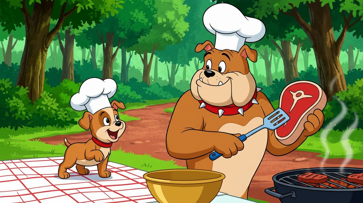 A highly structured JSON prompt for Nano Banana 2 detailing the generation of a vibrant, cheerful classic cel animation still featuring two anthropomorphic bulldogs having an outdoor barbecue, specifying subject, style, composition, lighting, and color palette.