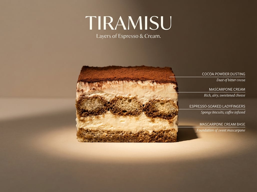 A highly specific prompt for generating a hyperreal, architectural food photograph of a tiramisu cross-section, detailing visible layers, textures, lighting (dramatic left side lighting), and labeling the ingredients like a scientific illustration, inspired by Wes Anderson aesthetics.