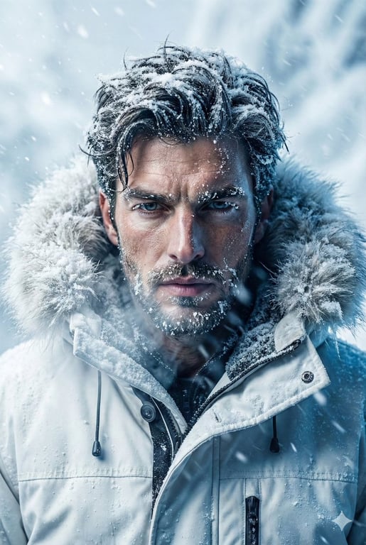 A prompt for transforming a subject into an ultra-realistic 4K medium-shot portrait of a determined arctic explorer. It focuses on detailed textures like frosted fur, realistic stubble, and a visible breath plume, set against a whiteout blizzard with dramatic, high-contrast blue-tinted lighting.