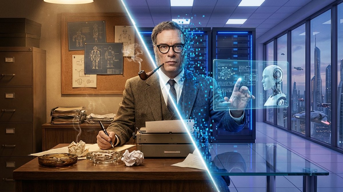 A complex, multi-step prompt designed to generate a cinematic concept art image (16:9) that visually splits a scene diagonally, contrasting a visionary's historical workspace (e.g., Asimov) with the modern realization of their ideas, using contrasting lighting and elements.