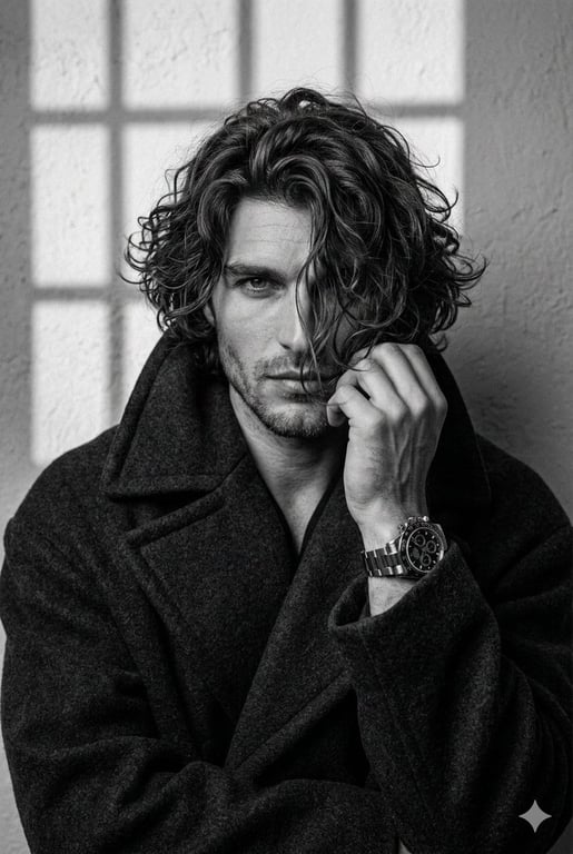 A prompt for generating a black and white aesthetic close-up portrait of a stylish person, requiring 100% face-accuracy based on an attached image. The prompt details the subject's attire, pose, and the moody, artistic atmosphere created by window shadows.
