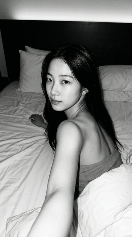 A detailed JSON prompt for Gemini Nano Banana 2 to create an ultra-photorealistic, black and white noir selfie of Kazuha from LE SSERAFIM, focusing on high contrast, athletic physique, and intimate, low-light bedroom setting, mimicking an iPhone 15 Pro Max aesthetic.