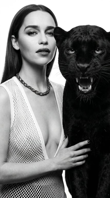 A structured JSON prompt for Nano Banana 2 to create a photorealistic, high-contrast black-and-white editorial portrait featuring a majestic panther and a young woman. The prompt specifies dramatic studio lighting, gothic chic aesthetic, and detailed negative prompts to ensure high quality and focus.