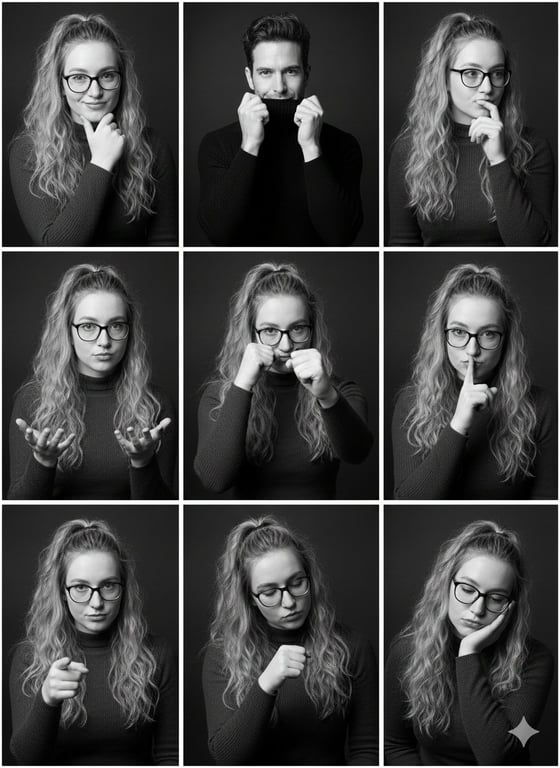 A prompt for generating a black and white studio portrait collage in a 3x3 vertical grid, featuring the same woman in nine different expressions and poses. The focus is on a clean, dark background, soft studio lighting, and an editorial fashion style with minimal retouching.