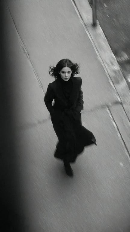 A prompt for generating a high-contrast, black and white photograph in the style of a Vogue fashion shoot, featuring a woman in motion on a street, captured from an elevated perspective with cinematic realism.