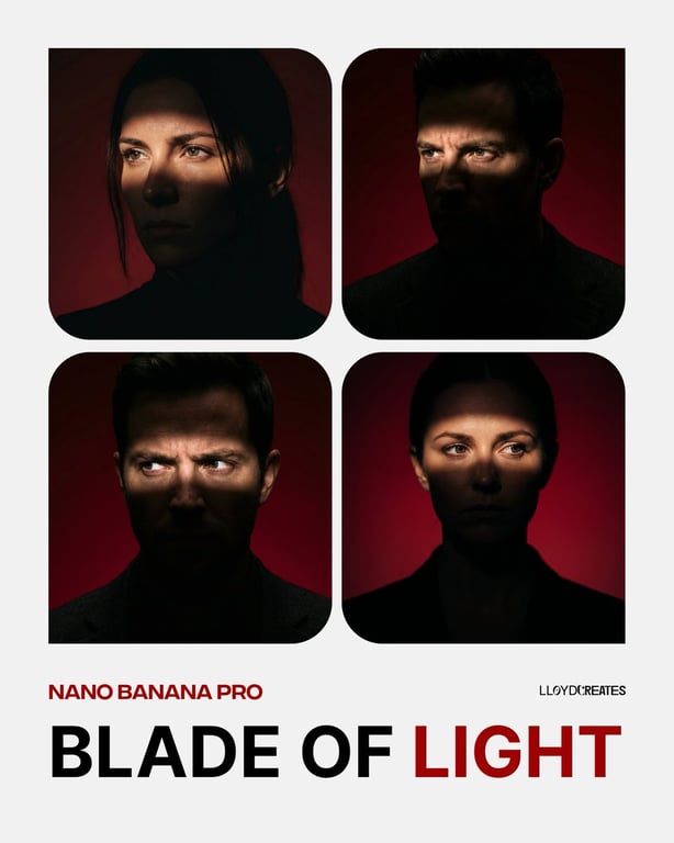 A dynamic portrait prompt utilizing high-contrast chiaroscuro lighting. It specifies a soft horizontal band of light illuminating only the subject's eyes and partial forehead, casting the rest of the face into deep shadow, resembling a high-end V-RAPTOR camera shot.