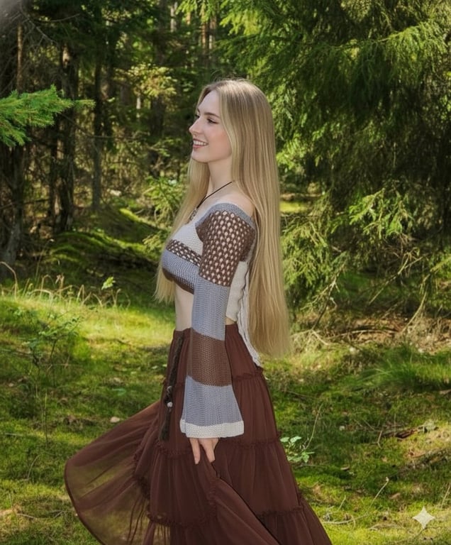 A highly detailed prompt for generating a photorealistic, dreamy boho editorial image of a young woman in a dense pine forest. It specifies her appearance (long blonde hair, serene expression), wardrobe (handcrafted crochet top, layered tulle skirt), and the environment (golden hour light filtering through trees, soft moss). The prompt emphasizes ultra-high resolution, shallow depth of field, and a cinematic aesthetic.
