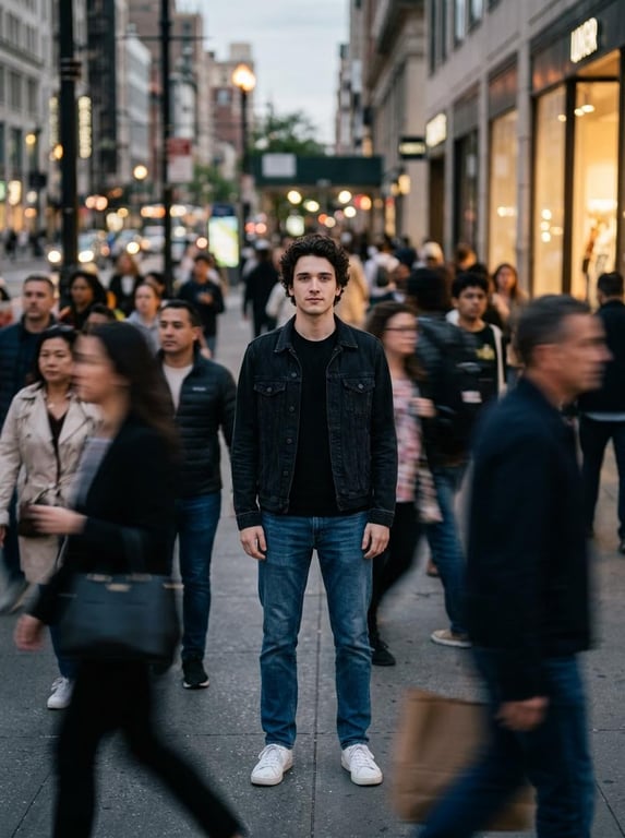 A prompt for Gemini Nano Banana 2 to create a realistic photo of a person (using an uploaded face image) standing still and sharp in the middle of a busy street. The background crowd and traffic are motion-blurred, emphasizing the subject's calm focus amidst chaos, using eye-level cinematic lighting.