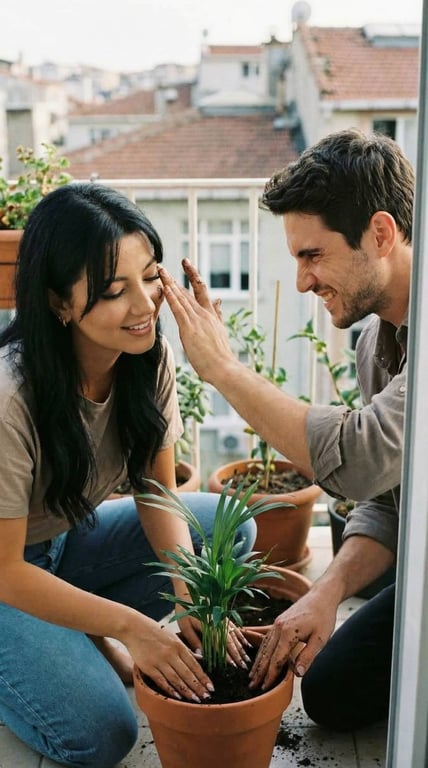 A detailed, JSON-formatted prompt for generating an ultra-photorealistic, candid film still of a couple planting a houseplant on an Istanbul apartment balcony, emphasizing natural lighting, real textures, and a mood of shared growth.