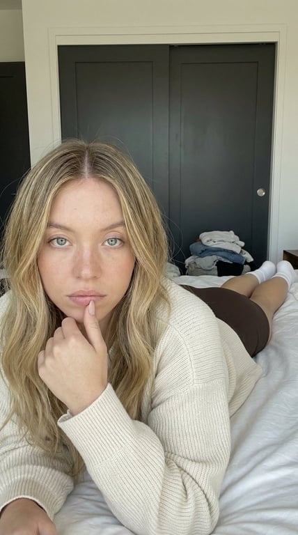 A detailed JSON prompt for generating an image of a celebrity (Sydney Sweeney, Ana de Armas, or Billie Eilish) in a casual bedroom setting. The prompt specifies the subject's appearance (brunette hair, freckles, neutral expression), pose (lying prone on a bed), clothing (oversized cream sweater, dark shorts), background details (dark closet doors, laundry pile), and lighting/composition for a low-angle, soft daylight shot with shallow depth of field.