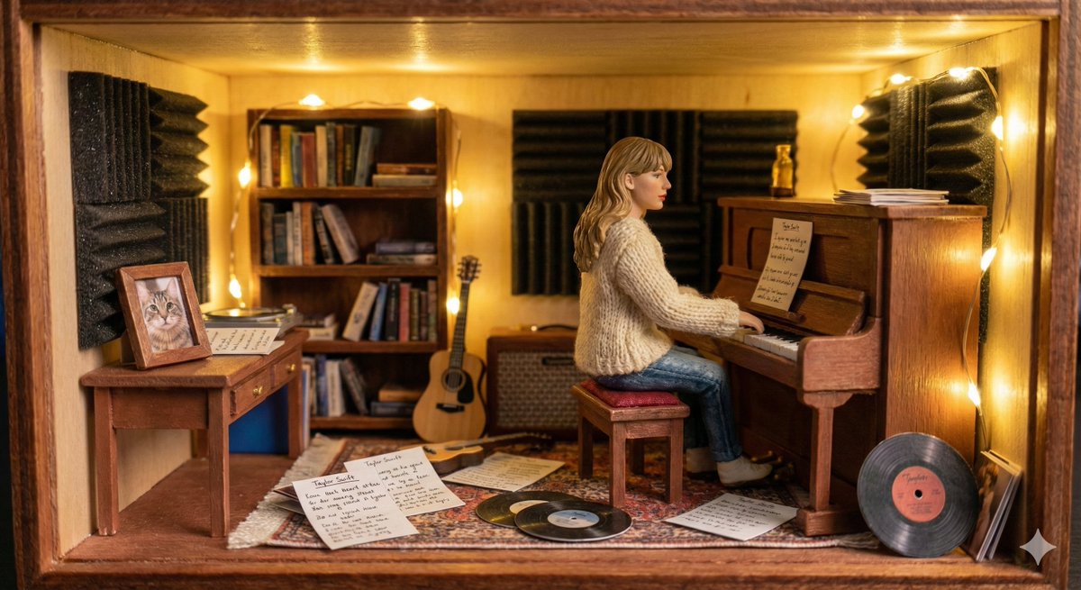 A prompt for Gemini Nano Banana Pro to create a miniature diorama of a celebrity inside a stylized environment that reflects their public persona, using tiny furniture, props, and cinematic lighting.