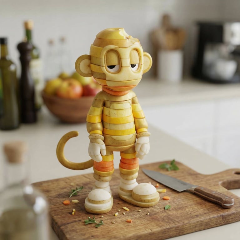 A detailed prompt for Nano Banana Pro designed to convert an uploaded character reference into a realistic 3D render made entirely of layered, sliced fruits and vegetables, maintaining the original character's proportions, colors, and identity while ensuring all materials, including footwear, are constructed from produce slices.