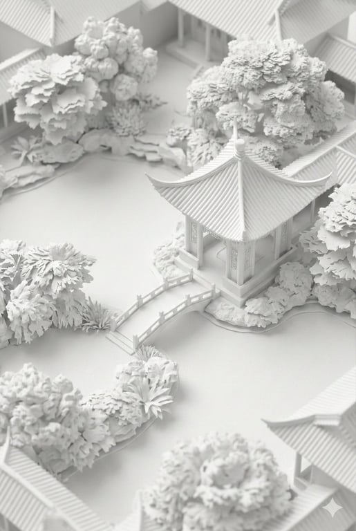 A detailed image generation prompt, labeled 'Banana Prompt,' designed to create a close-up, high-angle, vertical composition of a traditional Chinese garden courtyard. The style is specified as a miniature effect, clay render, monochromatic pure white, with embossed paper texture and strong ambient occlusion, suitable for architectural visualization.
