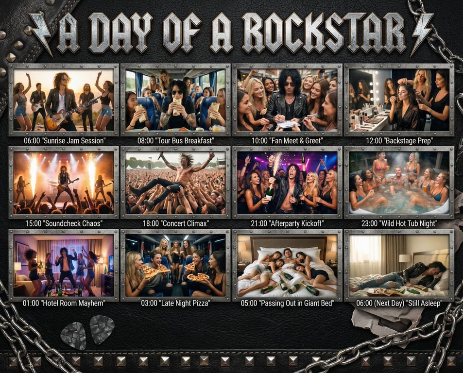 This is a detailed image generation prompt designed to create a 12-panel (4x3) cinematic timeline. It captures an epic, chaotic, or hilarious day in the life of a specified subject, complete with timestamps, punchy captions, and richly detailed scenes. The overall visual UI, backdrop, and panel frames are themed to match the subject's universe, such as arcane scrolls for wizards or chrome HUD for cyborgs.
