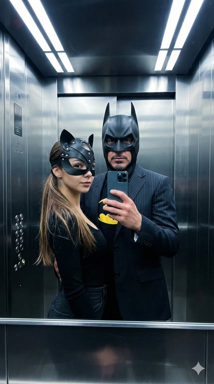 A highly structured prompt for generating a photorealistic cinematic mirror selfie inside a stainless-steel elevator, featuring two subjects (male and female) whose identities must be strictly preserved from two separate reference images. The subjects are styled as a 'Bat' (cowl, yellow emblem) and a 'Cat' (mask, fitted black outfit), focusing on accurate mirror physics and sharp faces.