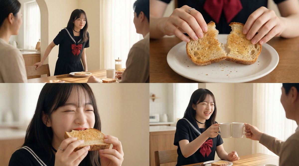 A cinematic prompt used for generating four images with Nano Banana Pro, which were then used sequentially to create a video with Kling 3.0 Omni. The prompt describes a heartwarming breakfast scene with parents and children, focusing on detailed actions, expressions, and ASMR sounds.