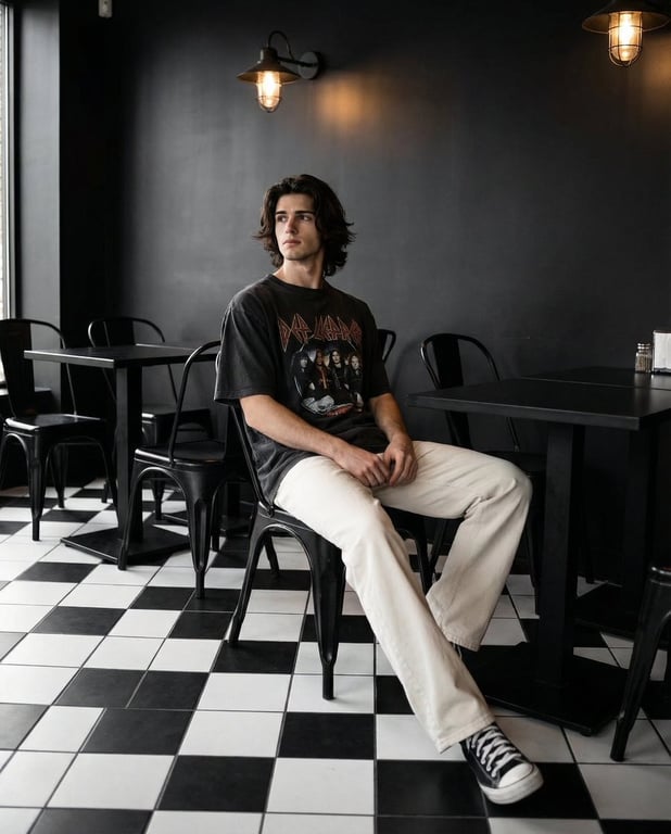 A prompt for generating a full-body cinematic portrait of a stylish young man in a monochrome cafe setting, emphasizing high contrast, specific clothing, and architectural details.