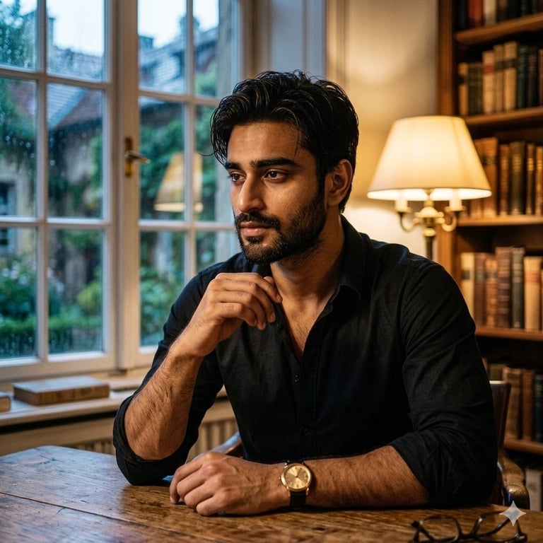A structured JSON prompt for generating a hyperrealistic, cinematic still photograph of a handsome South Asian man in a cozy home library. The prompt emphasizes dramatic Chiaroscuro lighting, where warm lamplight contrasts with cooler light from a rain-slicked window, focusing sharply on the subject and his classic leather watch.