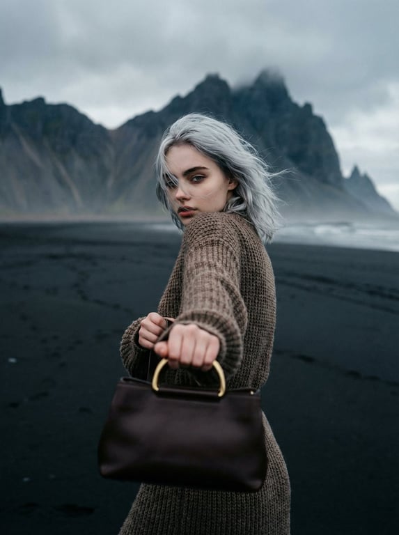 A prompt for generating a cinematic fashion photograph sequence on a cold northern black sand beach, featuring a woman in a knitted sweater dress against dramatic mountains, emphasizing a minimalist Nordic aesthetic, moody atmosphere, and multiple camera shots.