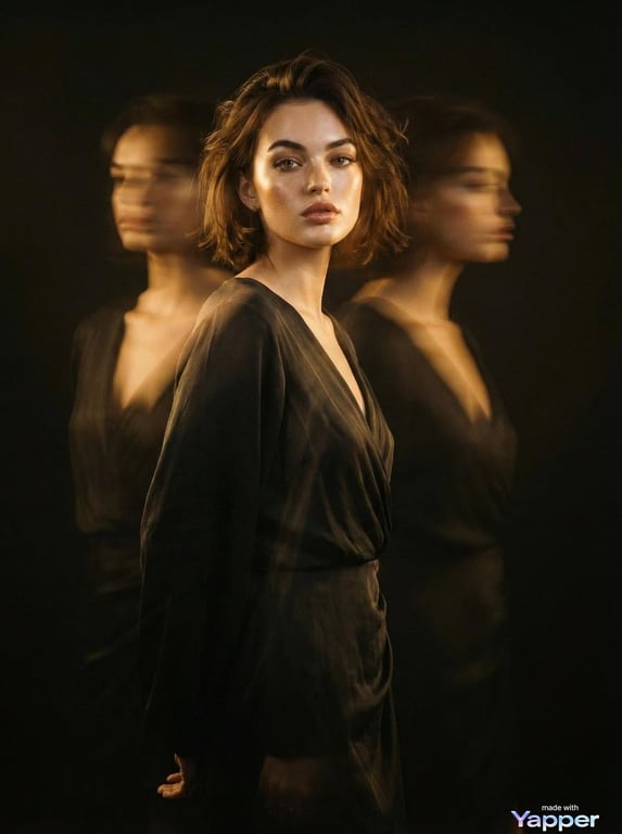 A prompt for a cinematic fashion portrait featuring an elegant young woman in a vintage dress. The key element is the surreal double-exposure effect created by motion blur ghost figures moving around her, set against a dark, moody studio with warm golden lighting.