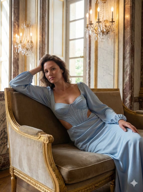 A highly complex JSON prompt for generating a photorealistic cinematic fashion scene in an elegant French palace salon, featuring an adult woman lounging in a light blue satin gown. The prompt mandates strict preservation of facial identity from a reference photo and details realistic skin texture, fabric physics, and high-end fashion photography aesthetics.