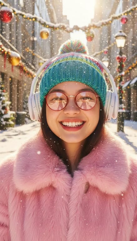 A structured prompt for generating a cinematic lifestyle photograph of a young woman in festive winter attire (pink faux-fur coat, knit beanie, round tinted glasses) on a snowy city street, emphasizing shallow depth of field, creamy bokeh lights, and warm golden sunlight.